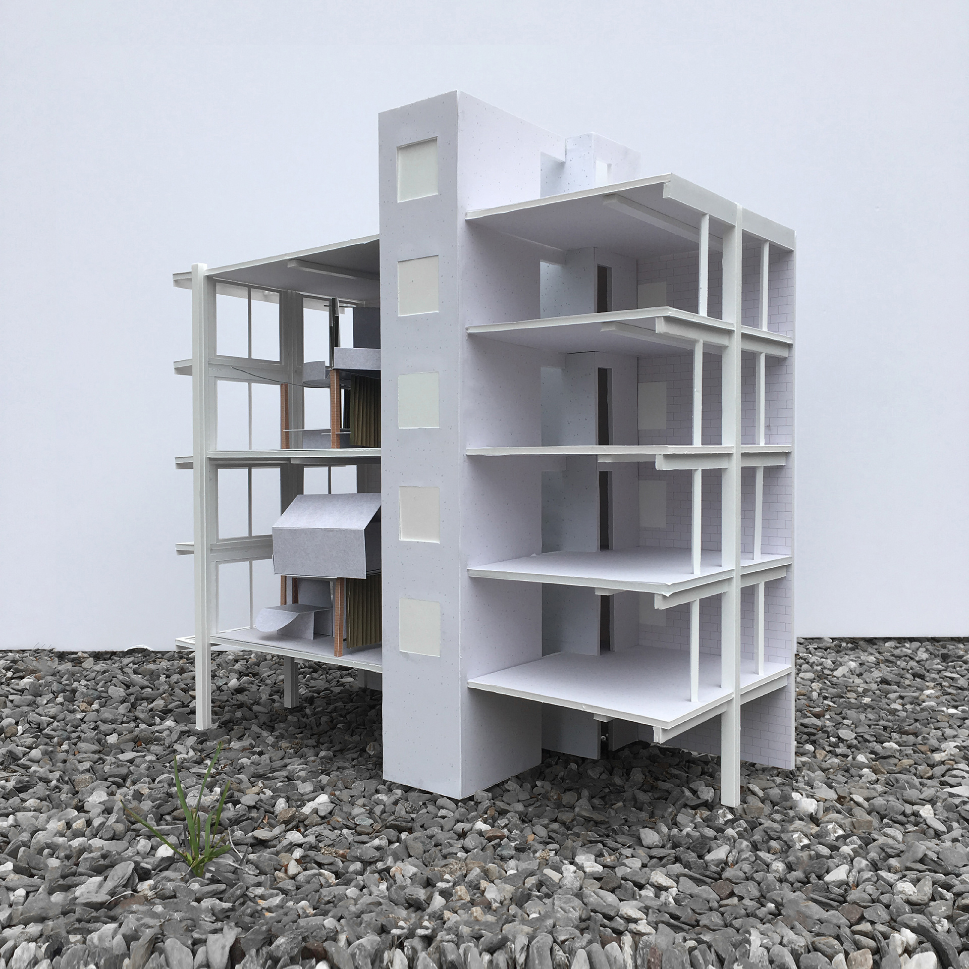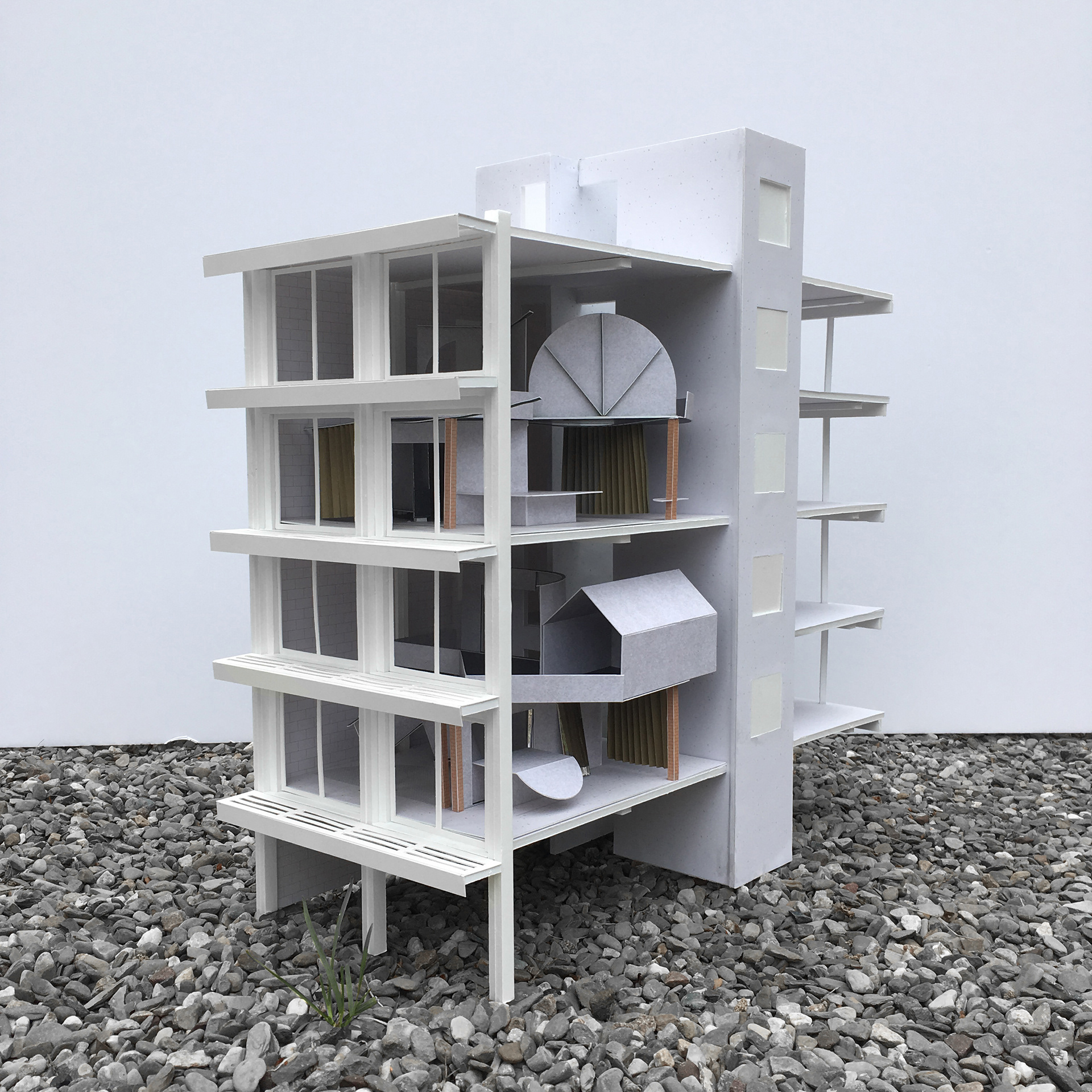 The economic and didactic value of the line is explored through its translation from drawing to standardized elements as instructional plans with distinct local spatial and flexible qualities. Railings, beams, interior wall finishes, columns, and furniture inform use and a hierarchy of construction for a stage set construction homes inserted into the front and back spaces of a generic apartment. The redensification scheme in Satillo, Mexico sets up a simple replicable structure of alternating loft spaces for small houses of leisure and rest to be negotiated within a generous framework. The kitchens and bathrooms hug the tectonic core which provides redundancy and a system of continuous replication and growth within the urban lots.