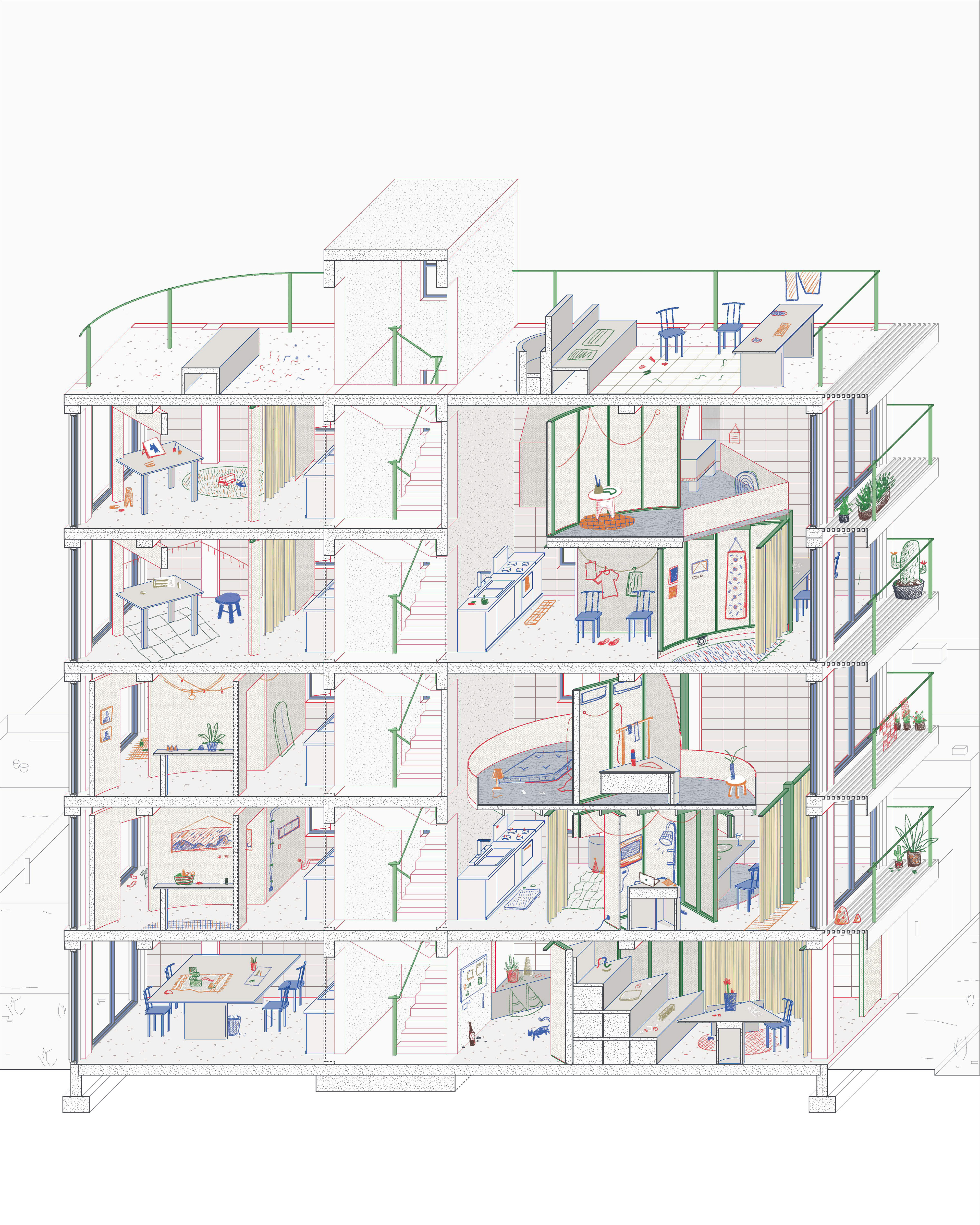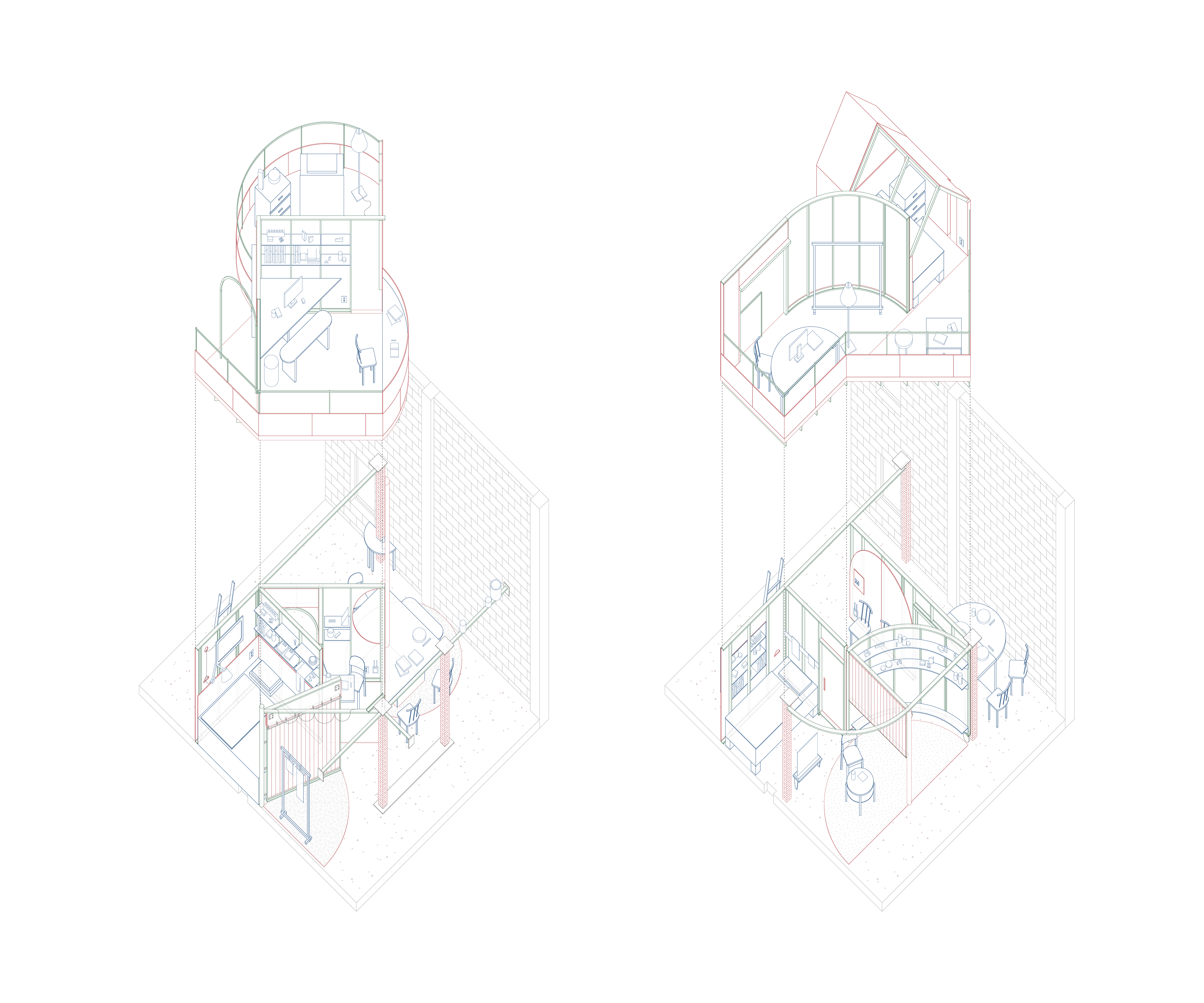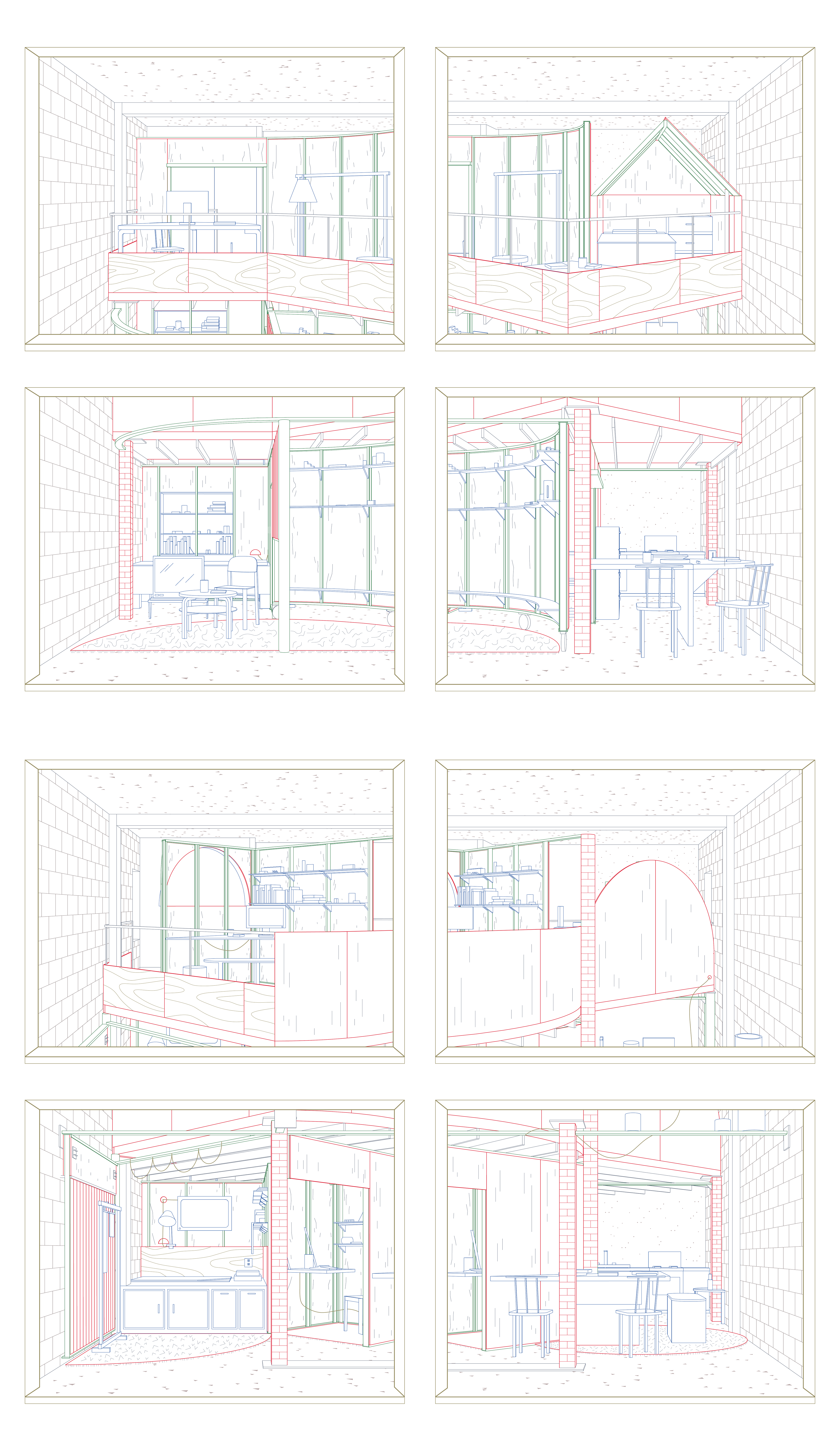 These loosely constructed homes which can be easily cut into, added upon, dismantled, and shifted around activates the accommodating tectonic shells into lively highly personalized homes of domestic negotiation. The multi-leveled density of elements hides the experience of coherent geometry in favor of a localized consideration of domestic living with split visual and temporal moments which suggest the composition of the overall graphic composition.