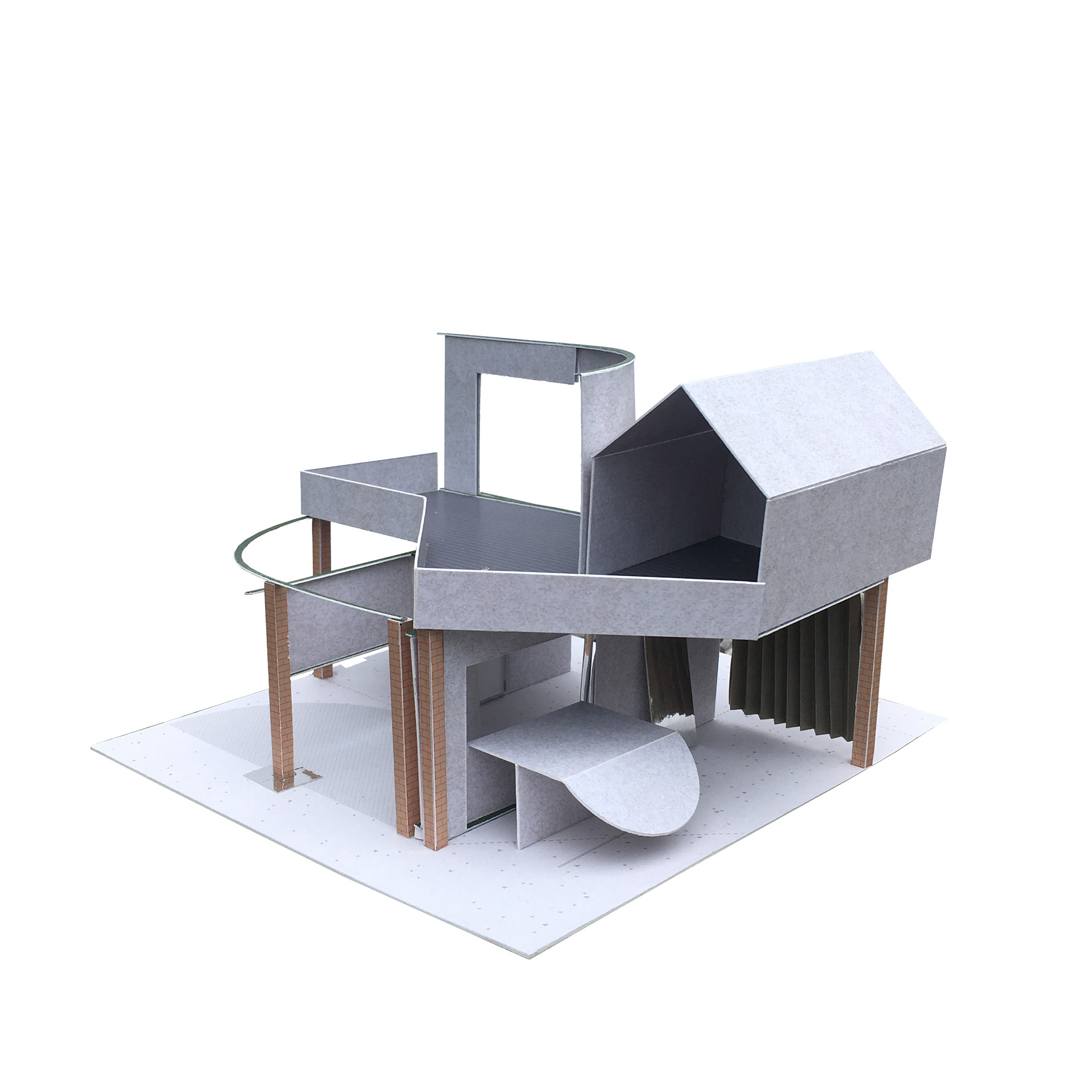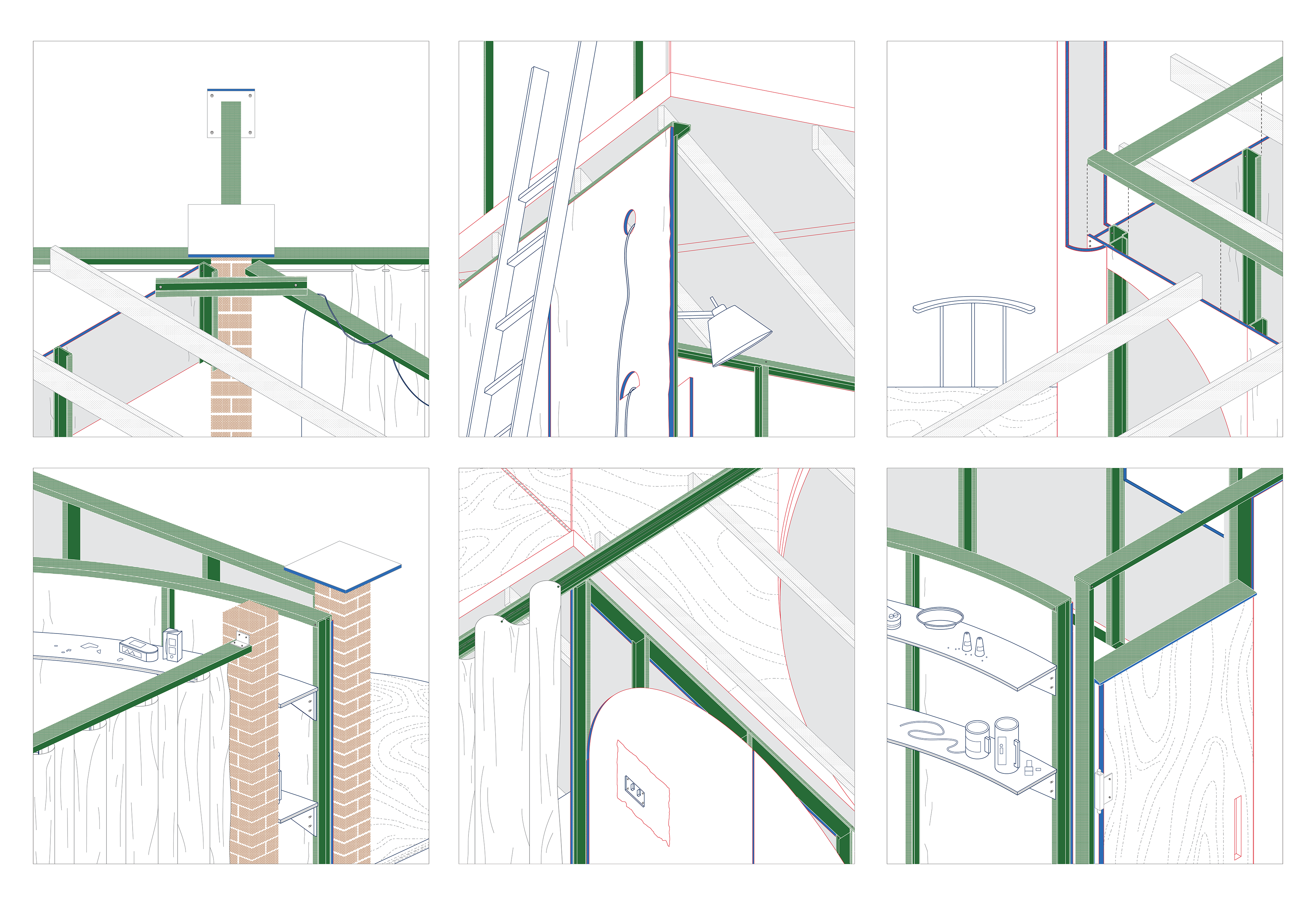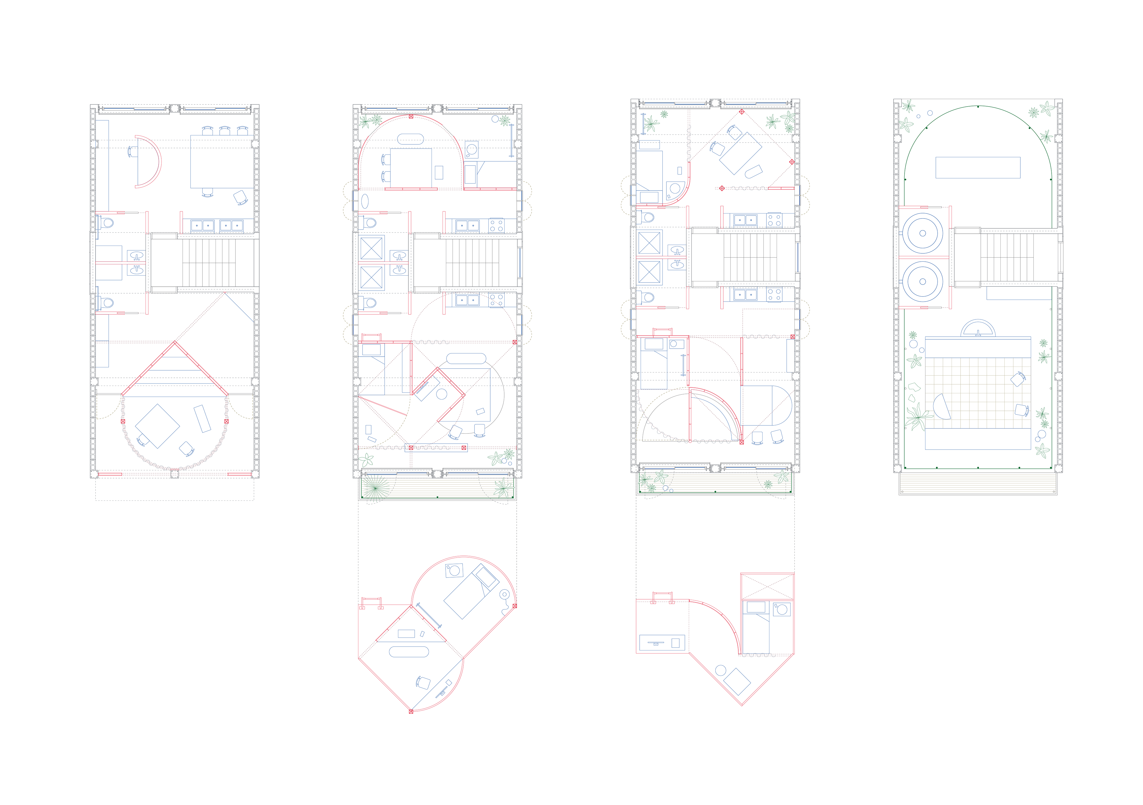 These loosely constructed homes which can be easily cut into, added upon, dismantled, and shifted around activates the accommodating tectonic shells into lively highly personalized homes of domestic negotiation. The multi-leveled density of elements hides the experience of coherent geometry in favor of a localized consideration of domestic living with split visual and temporal moments which suggest the composition of the overall graphic composition.