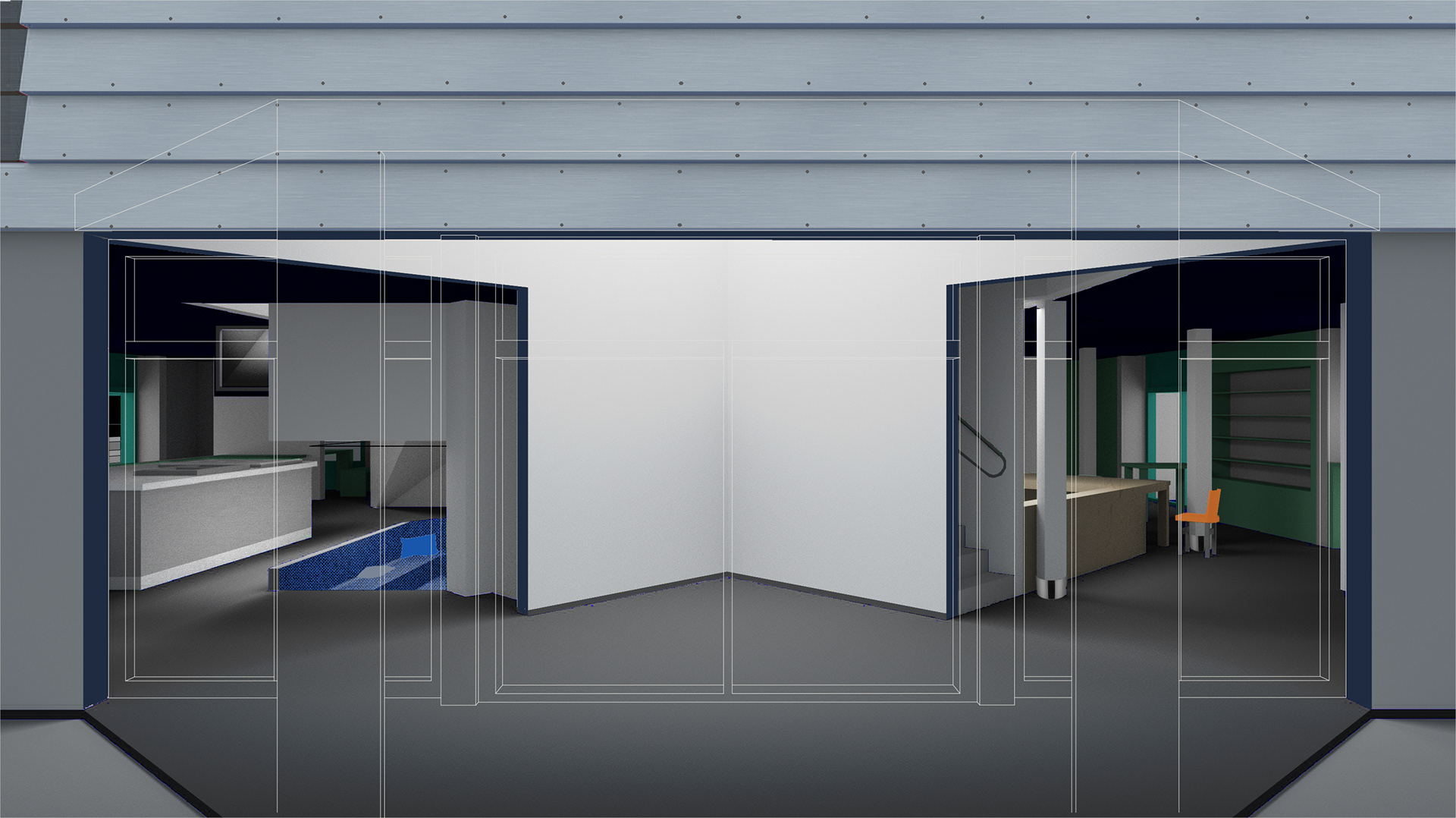 A wall moves up to obstruct light from the light wells while another rolls into the space as a projection surface dividing the room in half.
