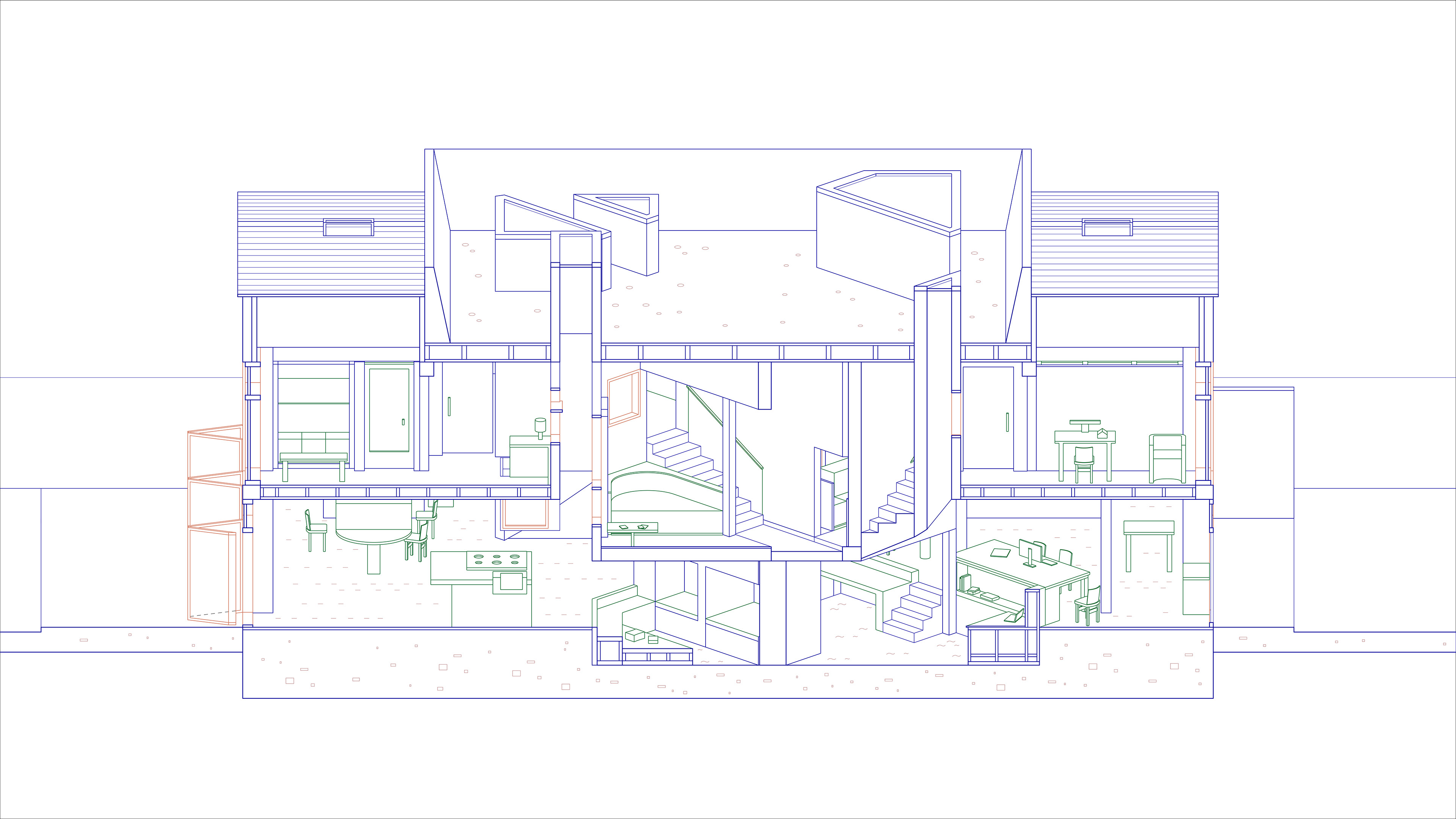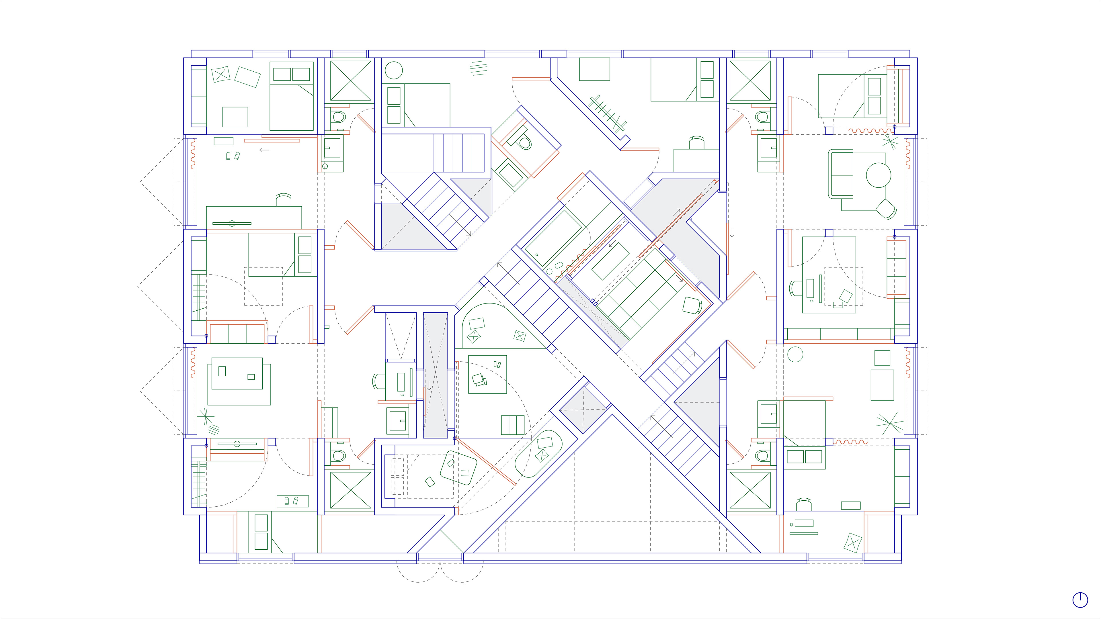 The house is divided into two floors - a floor of units and a ground floor of communal zones that serve as a local social condenser for tenants, their guests, and the immediate neighborhood.