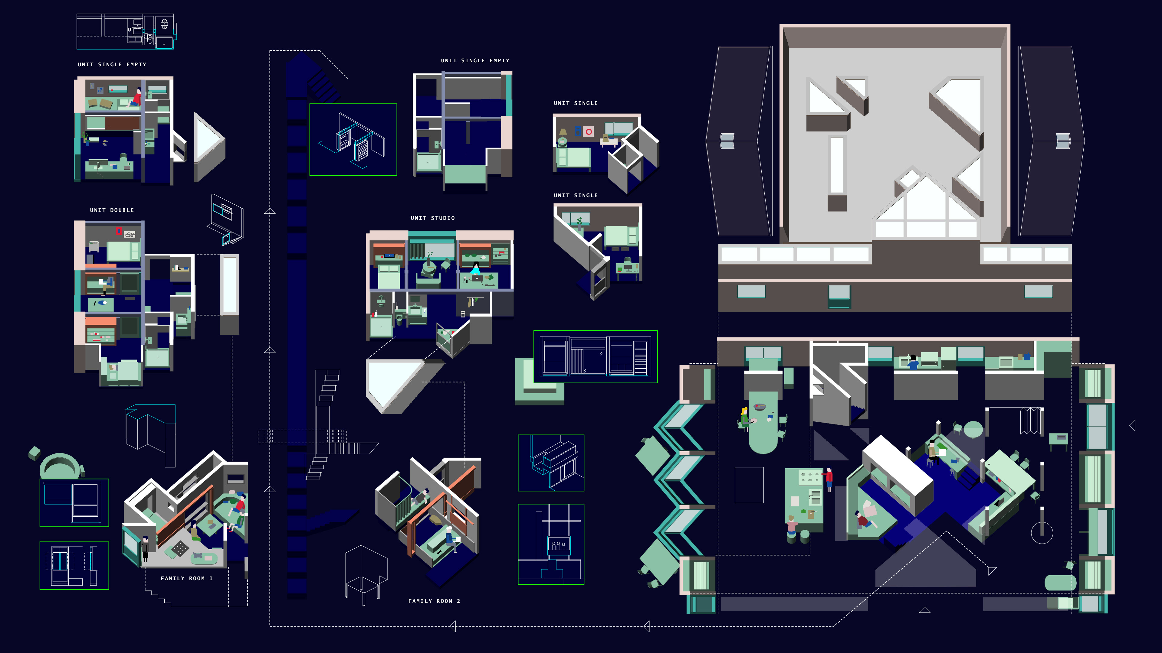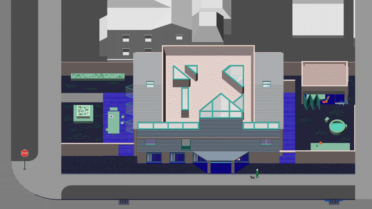 With the rising practice of securing lodging arrangements exclusively online, without ever visiting the place, the thesis resides as a virtual tour of a newly built single-family home for 7 located on a corner lot just outside the bustling accessible downtown core of Seattle. Given our current situation, architects could have expanded obligations to not only design the house but the interface that would facilitate people’s first impressions of the home. Future renters use the reference model, brochure, and map to navigate the house, collecting scattered animations, images, and drawings into their photo album that enrich their understanding of each particular room.